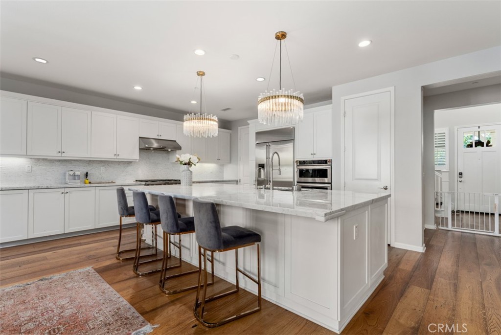 The home features 4 bedrooms, including a downstairs junior master suite with separate entry with its own AC, 4.5 baths, and a loft. The two-story foyer with light wood floors leads into the upgraded kitchen with white marble slab countertops, an oversized island, white marble tile backsplash, and upgraded stainless steel KitchenAid appliances. Upstairs, the master suite boasts hardwood floors throughout, and a fully upgraded marble master bath with marble floors, countertops, backsplash, full shower surround with rain shower, and a soaking tub.