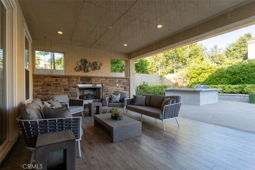 Modern amenities include fan pre-wires in every room, wood shutters, electric shades throughout, smart home capabilities, two AC units, and a 220-volt Tesla charger in the 3-car tandem garage. Perfect for entertaining, the thoughtfully landscaped backyard features a built-in BBQ island bar and sink, water fountain, raised sitting area with fire pit, lush landscaping, accent lights, and a California room with a fireplace.