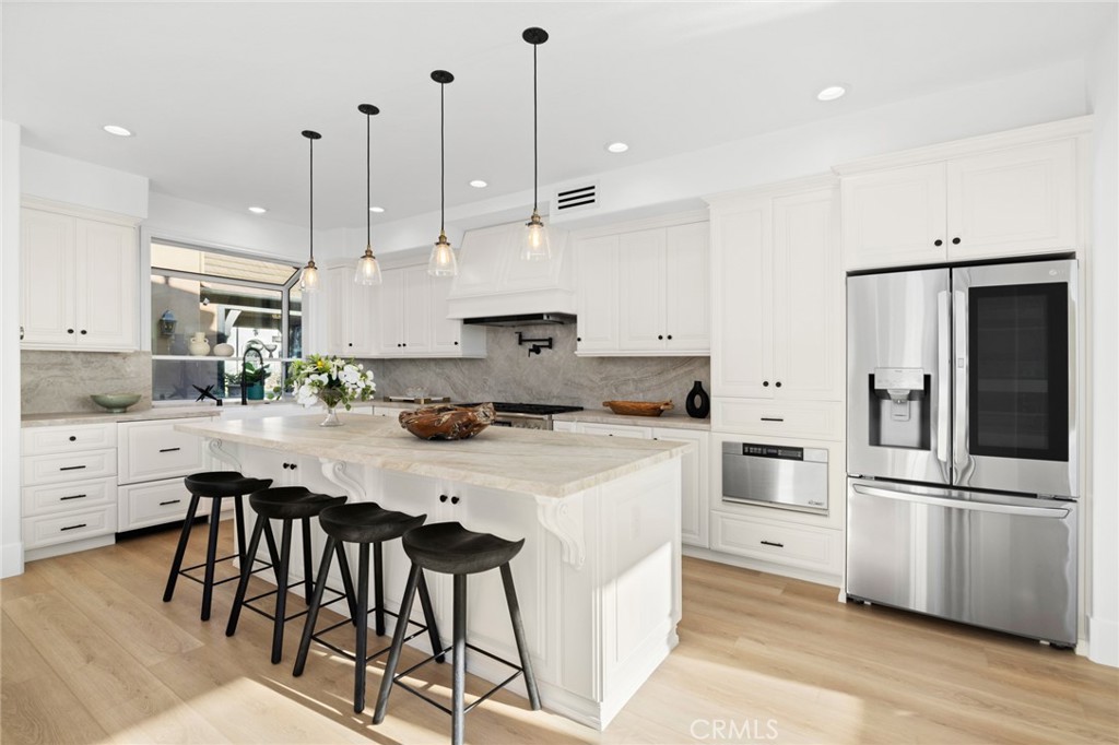 This exquisitely renovated 4-bedroom, 4-bathroom ocean-view residence is nestled on a prestigious cul-de-sac within the exclusive guard-gated enclave of Newport Ridge North. This home epitomizes luxury indoor-outdoor living. La Cantina doors open to reveal a newly remodeled open floor plan, featuring a gourmet kitchen adorned with top-tier stainless steel appliances and sumptuous leathered Taj Mahal quartzite countertops and backsplash.