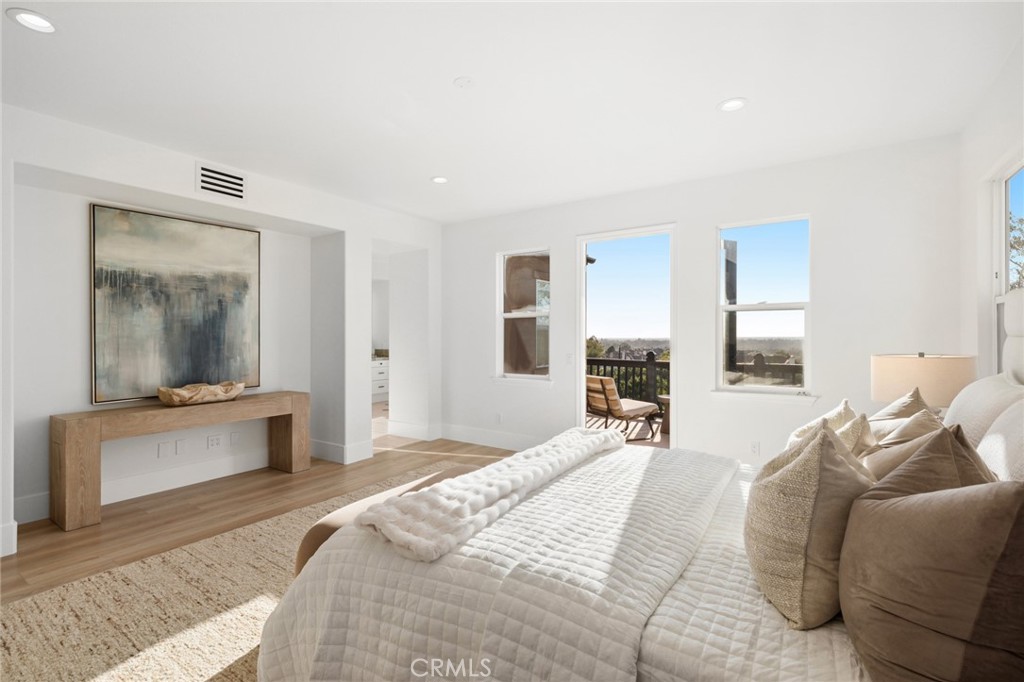The opulent primary suite offers serene panoramic ocean and city light views and is complemented by a private deck, cozy fireplace, custom walk-in closet, and an expansive bathroom complete with a spa tub and separate shower. A versatile downstairs bedroom includes exterior access, a full bathroom, and a walk-in closet.