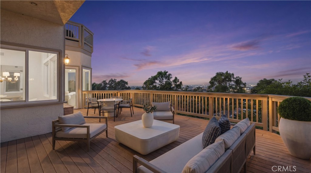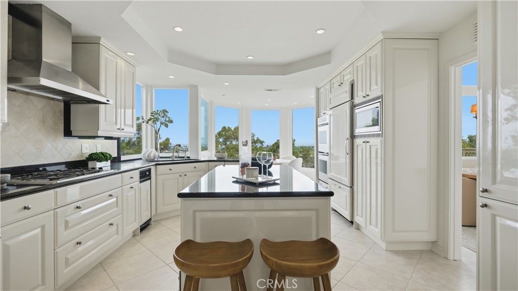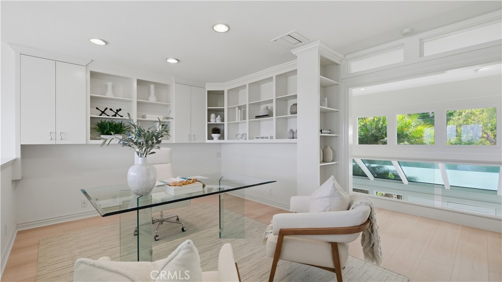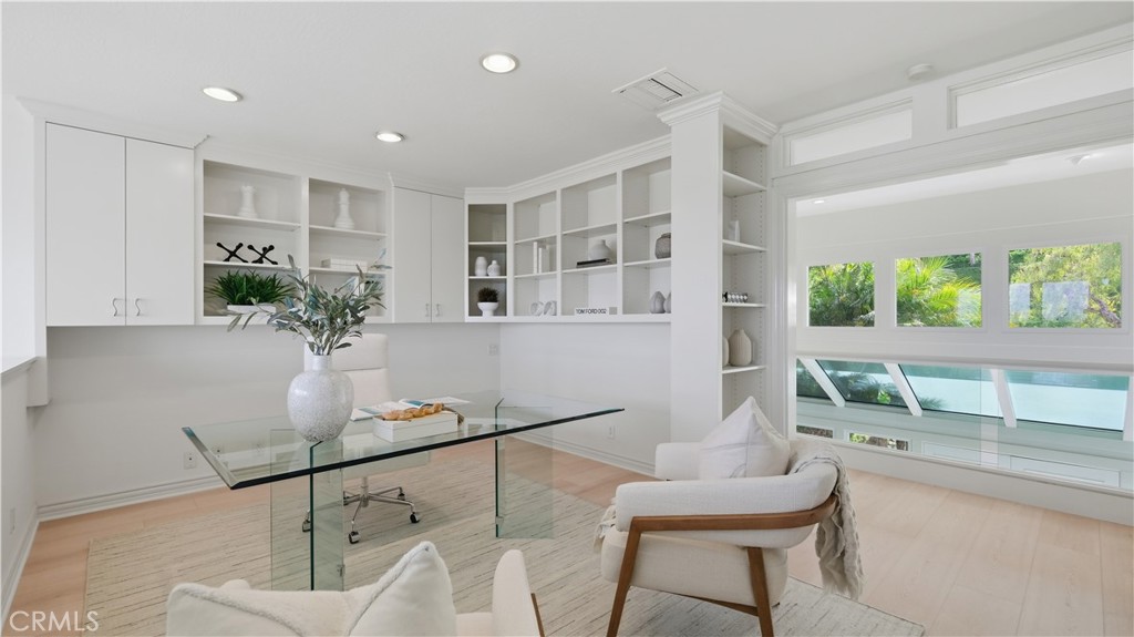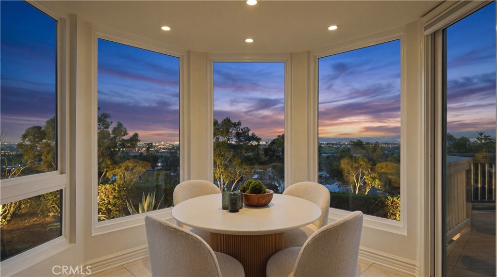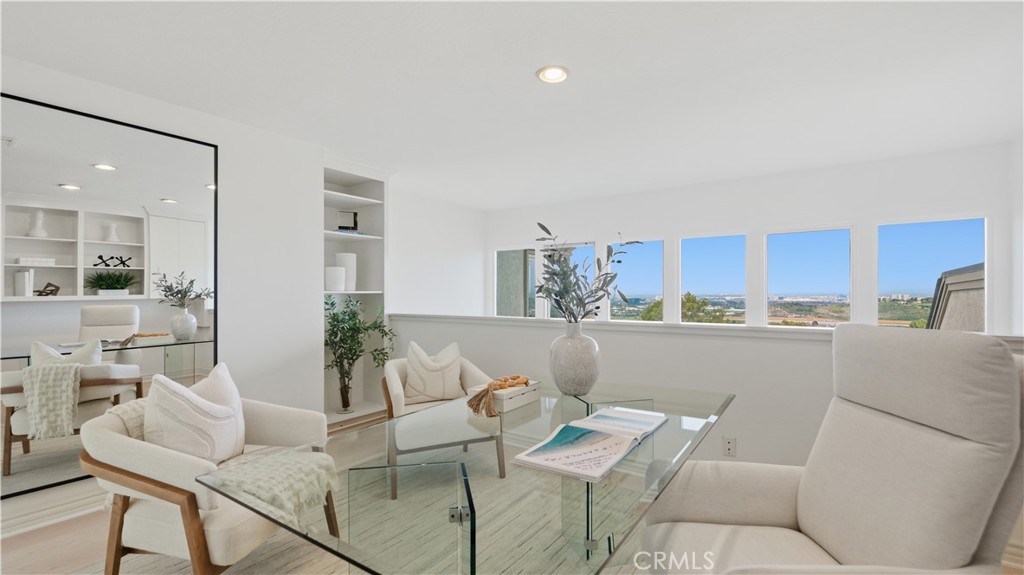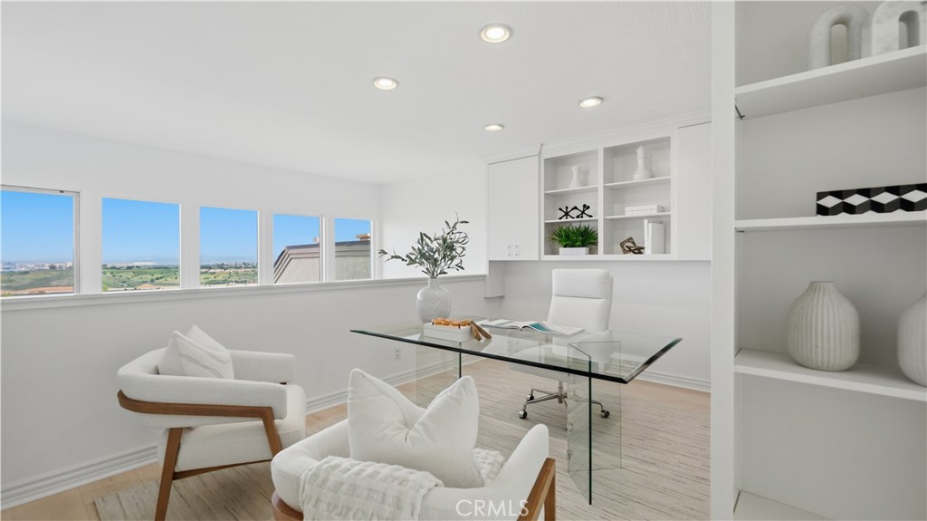 Located within the gated enclave of Harbor Ridge, this 3 bedroom + office, 3 bath residence enjoys elevated city and ocean views, and a thoughtfully designed floor plan that balances privacy and functionality throughout the home. A gated entry leads to a landscaped courtyard, creating a quiet and welcoming arrival. Inside, the interiors are light filled and refreshed, featuring skylights, recessed lighting, and clean, neutral finishes. The main living areas are highlighted by high ceilings and seamless access to multiple outdoor patios, enhancing everyday living and entertaining. The kitchen is designed for both everyday living and entertaining, featuring a center island, black onyx granite countertops, high end appliances, generous storage, and a casual dining area overlooking the garden. A full bathroom is conveniently located on the main level, providing ease of access for guests and daily use. The upstairs office offers built in workspace and a quiet setting, making it well suited for working from home. The primary suite features two walk in closets, including a spacious cedar lined dressing closet, and a well appointed bathroom with dual vanities, a soaking tub, and a separate shower. The suite also opens to a private balcony, offering open views and a peaceful extension of the living space. Residents of Harbor Ridge Estates enjoy access to community pools, spas, tennis courts, and walking trails, all conveniently located near Fashion Island, Pelican Hill, Newport Beach's coastline, and award-winning schools.