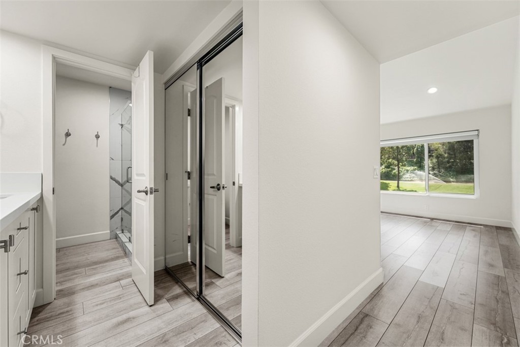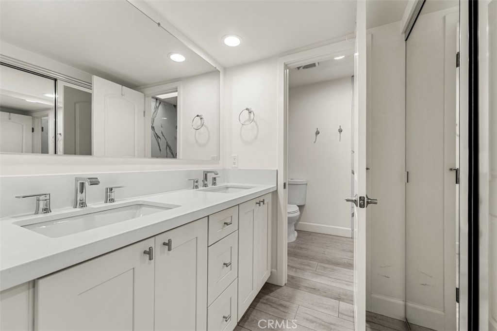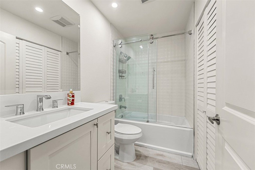 The spacious primary suite offers vaulted ceilings, a wall-to-wall mirrored closet with built-in organization, and a well-appointed en-suite bath featuring dual vanities and a floor-to-ceiling tiled walk-in shower. A generously sized secondary bedroom and full bath complete the interior.