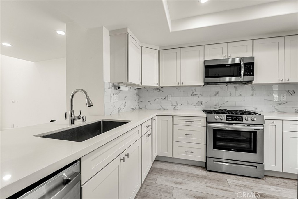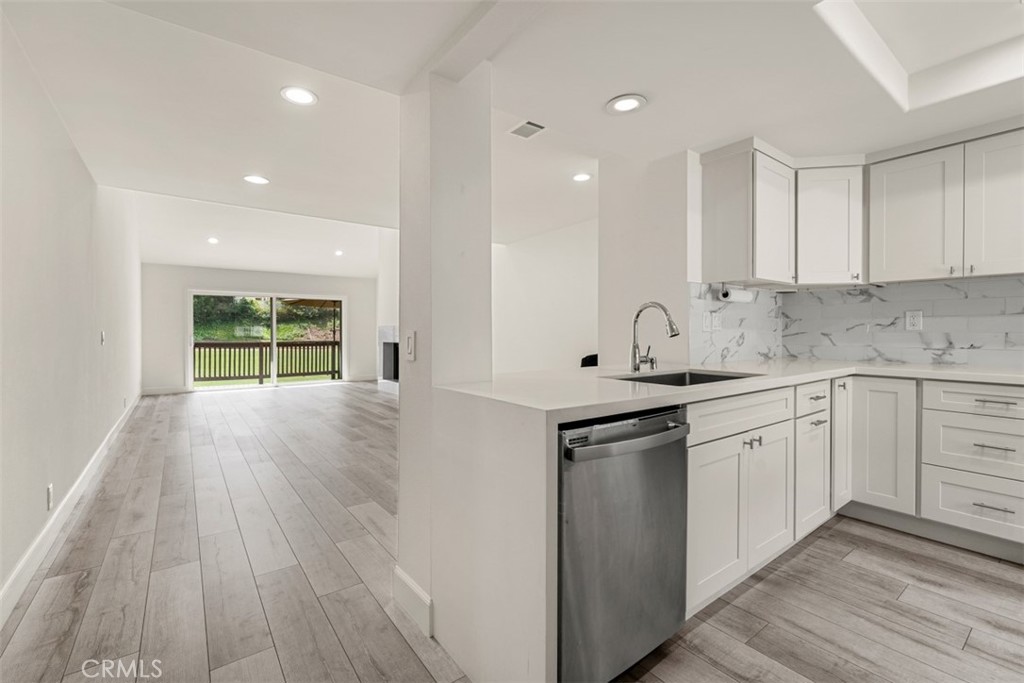 The kitchen has been tastefully remodeled with white shaker cabinetry, quartz countertops, stainless steel appliances, a single-basin sink, and newly added custom pull-out drawers for enhanced functionality. It opens effortlessly to the dining area, complete with breakfast bar seating.