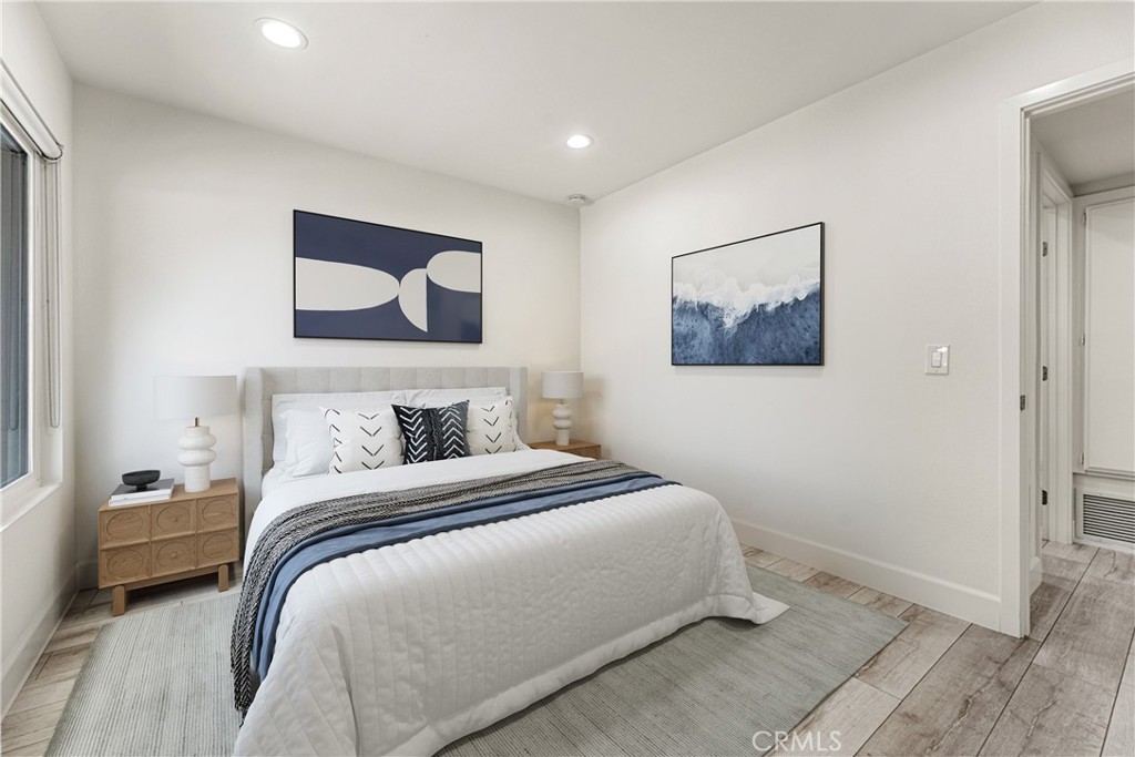 Recent upgrades include dual-pane vinyl windows, LED recessed lighting throughout, tall baseboards, and warm luxury vinyl plank flooring. Additional enhancements include a newly replaced electrical panel, top-of-the-line oversized washer and dryer, and a private two-car garage with freshly sealed epoxy flooring.