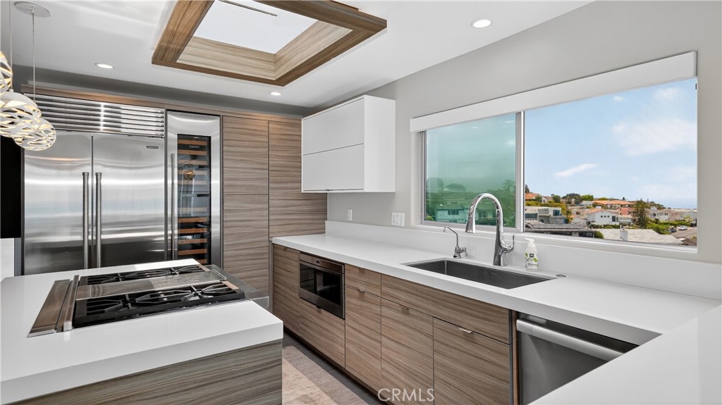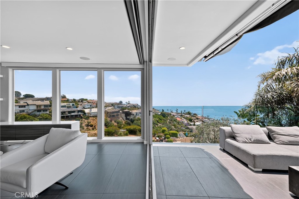Fully furnished. Open to 6 months, month to month, short term- negotiable. Located at the end of a private cul-de-sac atop Arch Beach Heights, this striking split-level contemporary residence offers unobstructed 180-degree ocean and coastline views, with Catalina Island and twinkling city lights stretching beyond Laguna Beach, visible from nearly every room. Set on an exceptionally rare double-wide lot, the home spans nearly 2,350 square feet and features 4 bedrooms, 3.5 baths, a dedicated office (optional 4th bedroom), a private theater, and a custom wine room. Originally reimagined in 2007 by acclaimed designers Anders Lasater and Mark Singer, the home blends bold design with timeless quality. The spacious primary suite includes a custom-built closet system and an expansive spa-like bathroom complete with a steam shower, soaking tub, and a built-in TV for the ultimate retreat. Upstairs, the main living area boasts an open-concept layout with hardwood and stone flooring, a chef's kitchen with stainless steel appliances--including a Bosch ultra-quiet dishwasher--cherry wood cabinetry, granite counters, skylights, a breakfast bar with a mini-fridge, and a center island cooktop. Sliding doors lead to both front and rear decks, seamlessly extending the living space outdoors. This exceptional property offers the rare combination of architectural sophistication, functional design, and breathtaking natural beauty. Just moments from world-class beaches, hiking trails, restaurants, and vibrant village life, this home is not only a peaceful retreat but also a gateway to the very best of coastal living. Whether you're entertaining guests or enjoying a quiet evening overlooking the Pacific, this one-of-a-kind residence delivers an unparalleled lifestyle experience.