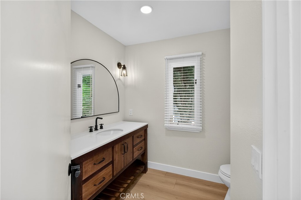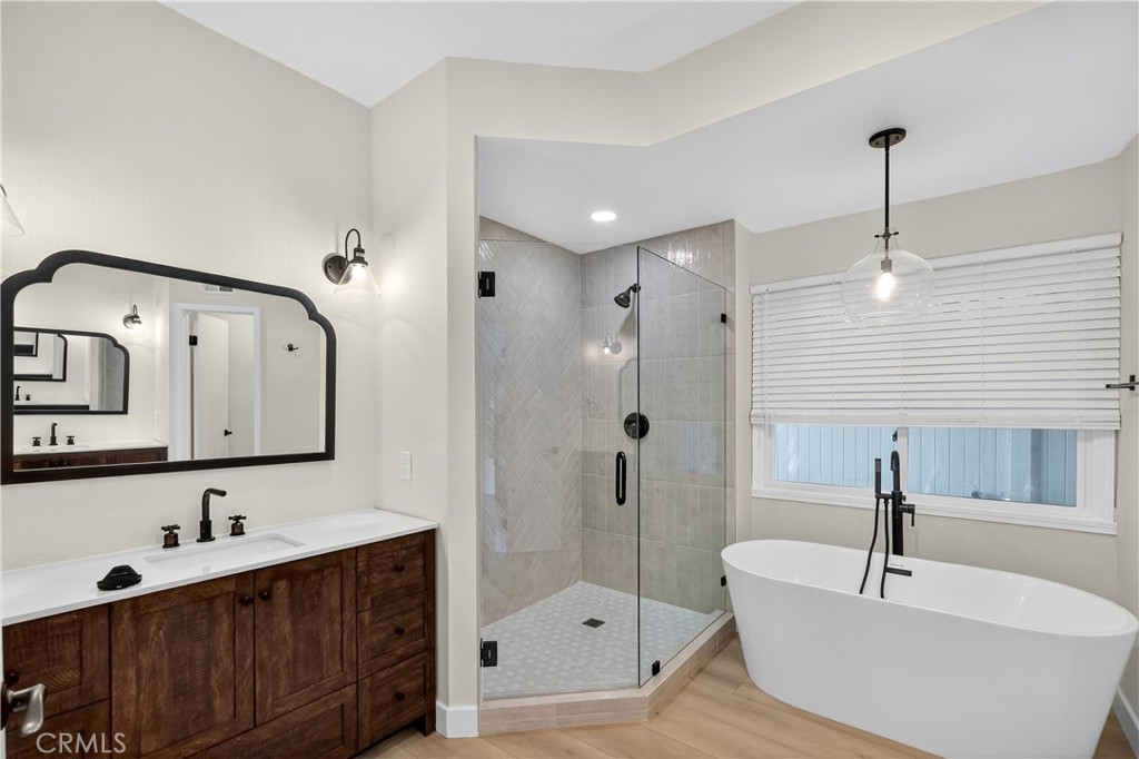 The luxurious primary suite includes a soaking tub, walk-in shower, dual sinks, and designer fixtures. All bathrooms are fully remodeled with premium finishes, including Kingston sinks and fixtures, new vanities, and modern tile. Additional upgrades include a brand new HVAC system, Samsung washer/dryer, custom laundry cabinetry with oversized utility sink, new interior door hardware, and a rebuilt entry deck.